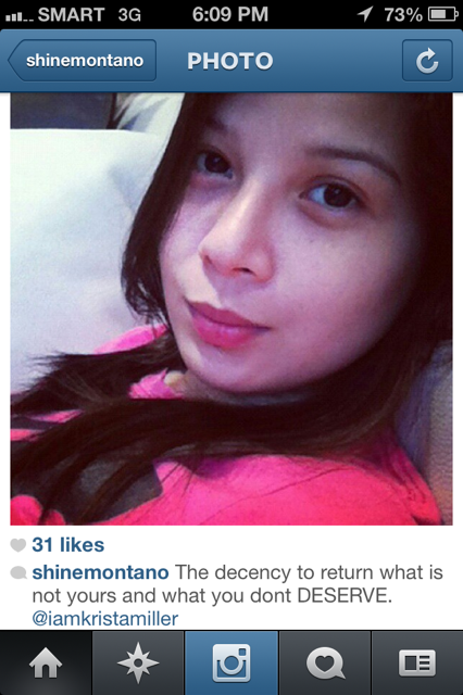 "You are so insensitive. What are you a non-living thing? Purchase your own husband! Get off my cousin's. It's never too late to change."Grade 1 Science bah ang labanan? Malamang si Krista ay hindi lang kabit o non living thing kung di solid, liquid o gas? LOL